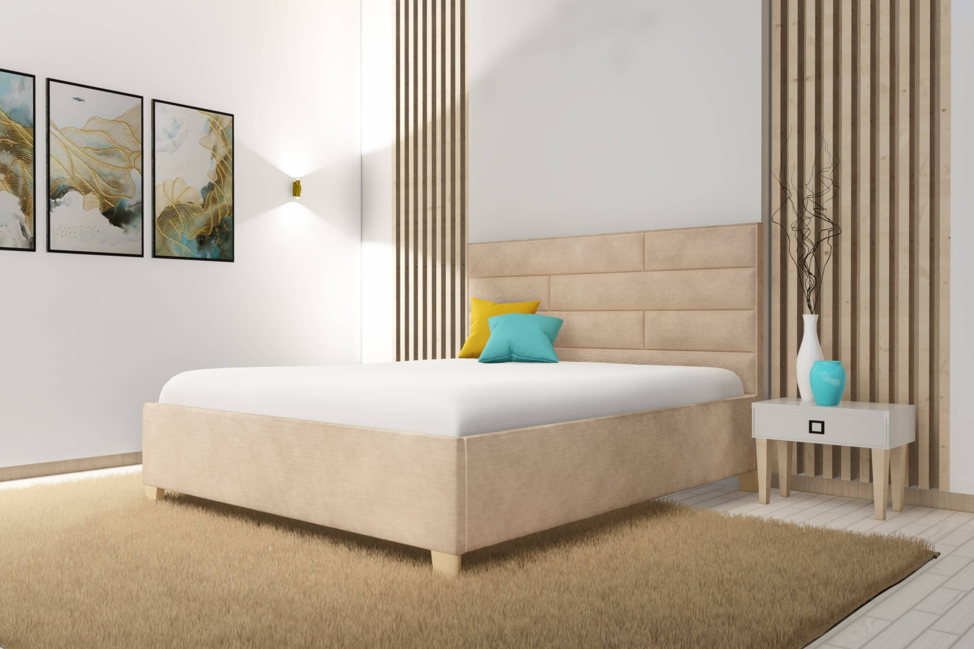 Luxusná čalúnená posteľ LAMDA s masívnou drevenou konštrukciou.