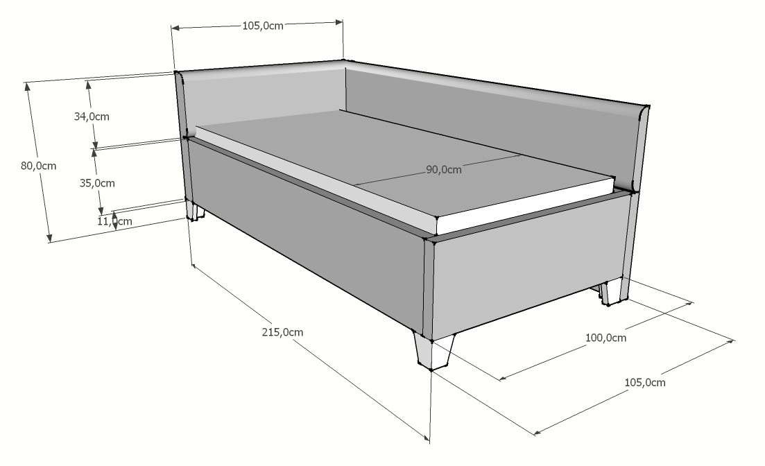 Devízou tejto postele je široká farebná škála poťahových látok, možnosť výberu farieb masívnych nožičiek a možnosť dokúpenia úložného priestoru.