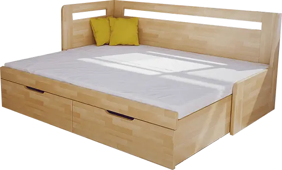 Stabilné vysúvacie postele z kvalitného slovenského buka sú vytvorené pre náročných zákazníkov kladúcich dôraz na trvácnosť výrobkov a kvalitu spracovania. Univerzálne použitie ako sedačka s pohodlnými opierkami a vankúšmi s možnosťou výberu farby pohľadovej látky, plnohodnotné jednolôžko a dvojlôžko pre príležitostné spanie. Rozkladacie postele v čistom a jednoduchom dizajne s ekologickou povrchovou úpravou poskytujú priestranný úložný priestor pod celou posteľou.