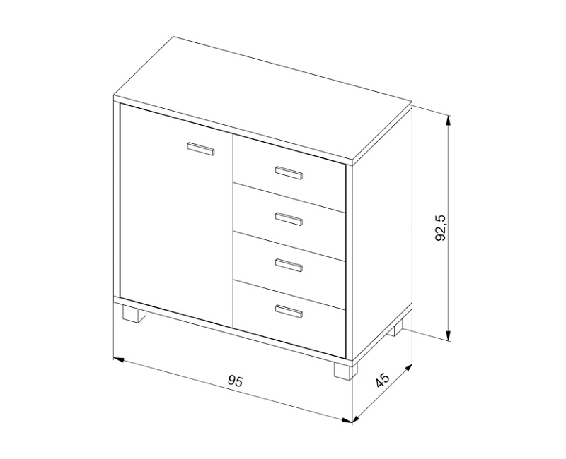 - dvierka v ľavej časti dodávané s 1 policou, 4 zásuvky v pravej časti s guľôčkovým výsuvom