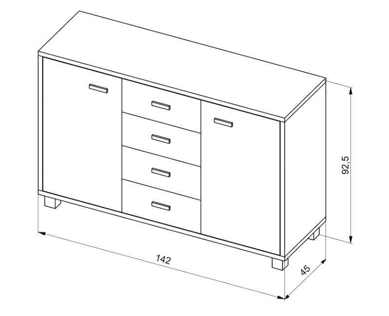 - dvierka v ľavej časti, 4 zásuvky v strednej časti na guľôčkový výsuv, dvierka v pravej časti