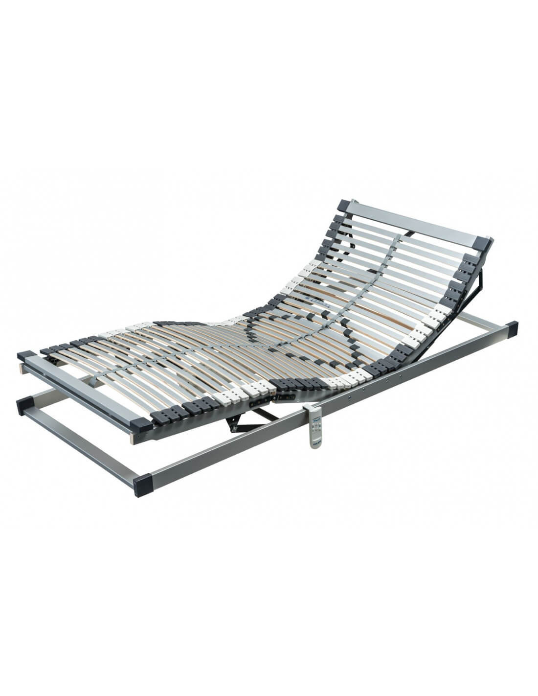 Exkluzívny elektrický lamelový rošt do postele TRIPLE MOBIL T12 s motorovým polohovaním časti pod hlavou a časti pod nohami je tvorený 42 lamelami, ktoré zaisťujú dobrú vetrateľnosť, odvod vlhkosti a rovnomerné rozloženie váhy. 12 zdvojených lamiel s posuvnými opaskami umožňuje regulovať tuhosť a tým aj tlak vytváraný na matrac v bedrovej oblasti. Posúvaním opaskov je možné tvrdosť matraca buď zvýšiť alebo znížiť. Pružné lamely uložené v trojiciach v kaučukových púzdrach sú rozložené do 7 anatomických zón. Stredový spevňujúci textilný popruh zaisťuje pevnosť roštu a bráni prelomeniu lamely pri extrémnom bodovom zaťažení. Prídavná lišta na okrajoch roštu rovnomerne podopiera matrac aj na okrajoch pri nohách a v hornej časti matraca. Zamedzuje deformácii okrajov matraca a predlžuje jeho životnosť. Polohovateľný posteľný rošt ponúka nosnosť až 130 kg.