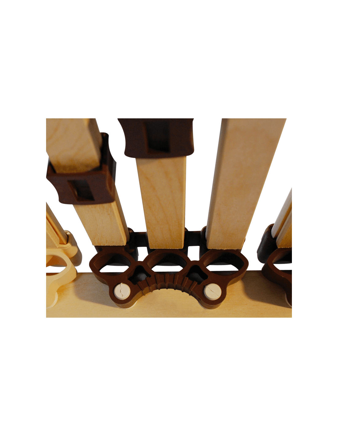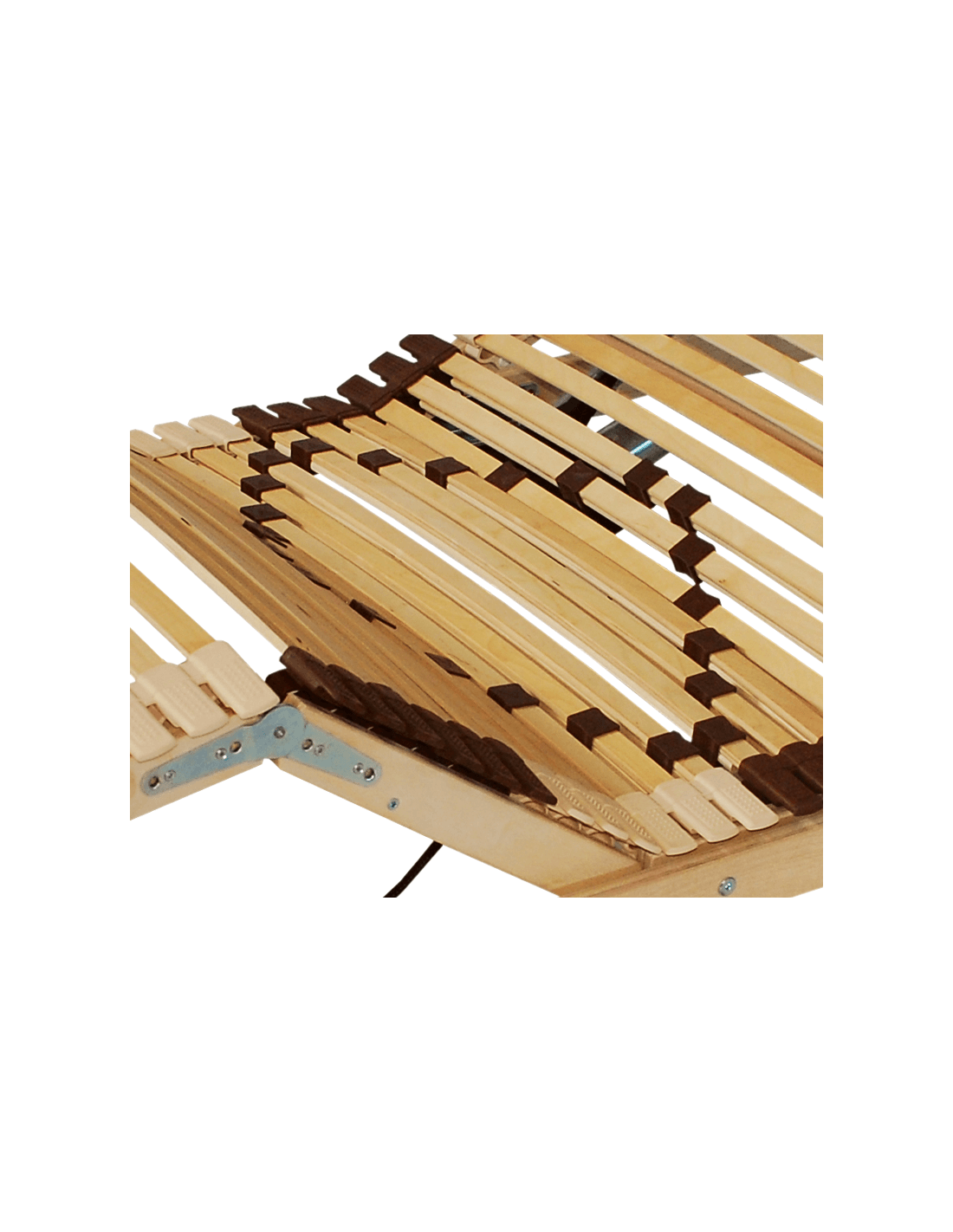 Vysoko kvalitný elektrický lamelový rošt do postele TRIPLE NATUR MOBIL T12 s motorovým polohovaním časti pod hlavou a časti pod nohami je tvorený 42 lamelami, ktoré zaisťujú dobrú vetrateľnosť, odvod vlhkosti a rovnomerné rozloženie váhy. 12 zdvojených lamiel s posuvnými opaskami umožňuje regulovať tuhosť a tým aj tlak vytváraný na matrac v bedrovej oblasti. Posúvaním opaskov je možné tvrdosť matraca buď zvýšiť alebo znížiť. Pružné lamely uložené v trojiciach v kaučukových púzdrach sú rozložené do 7 anatomických zón. Stredový spevňujúci textilný popruh zaisťuje pevnosť roštu a bráni prelomeniu lamely pri extrémnom bodovom zaťažení. Prídavná lišta na okrajoch roštu rovnomerne podopiera matrac aj na okrajoch pri nohách a v hornej časti matraca. Zamedzuje deformácii okrajov matraca a predlžuje jeho životnosť. Polohovateľný posteľný rošt ponúka nosnosť až 130 kg.