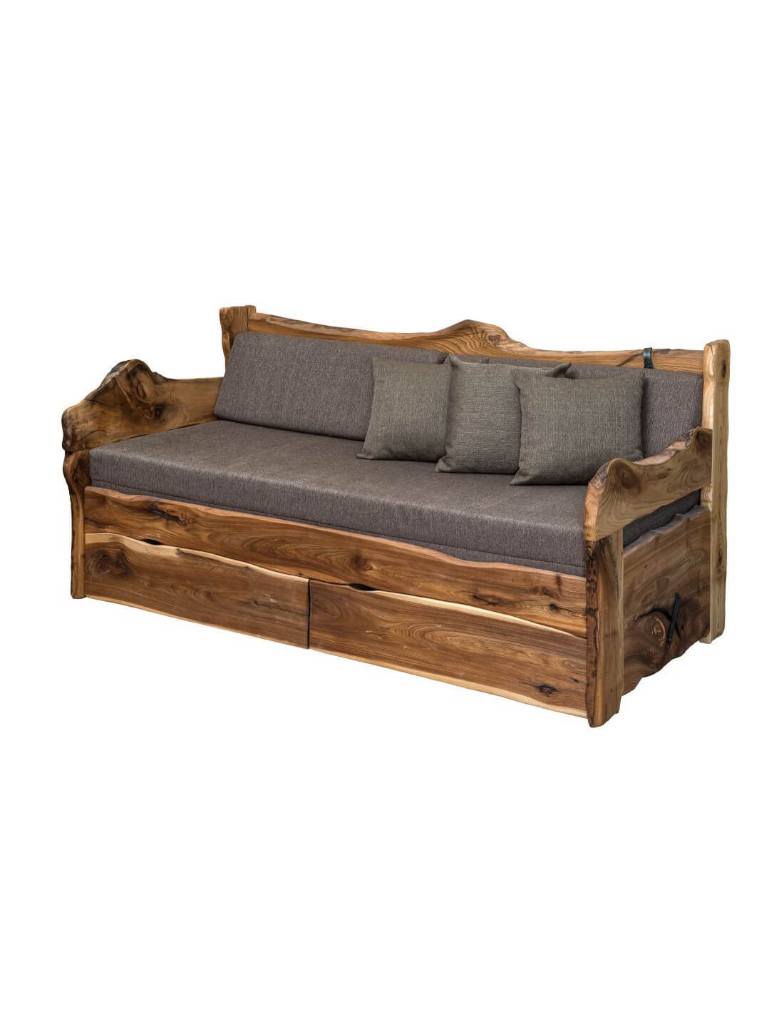 Masívna posteľ ALMA vysúvacia z brestového dreva 3 v 1 - sedačka, jednolôžko, dvojlôžko. Rozkladacia posteľ vyniká jedinečným hranolovým dizajnom s výraznou kresbou štruktúry dreva.